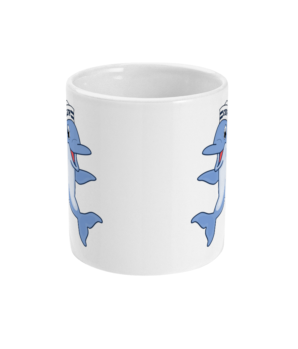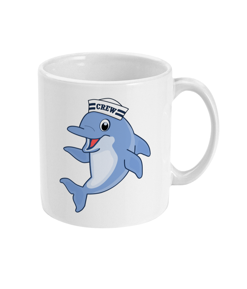 Dolphin Crew 11oz glossy white ceramic mug. Dishwasher & Microwave safe.