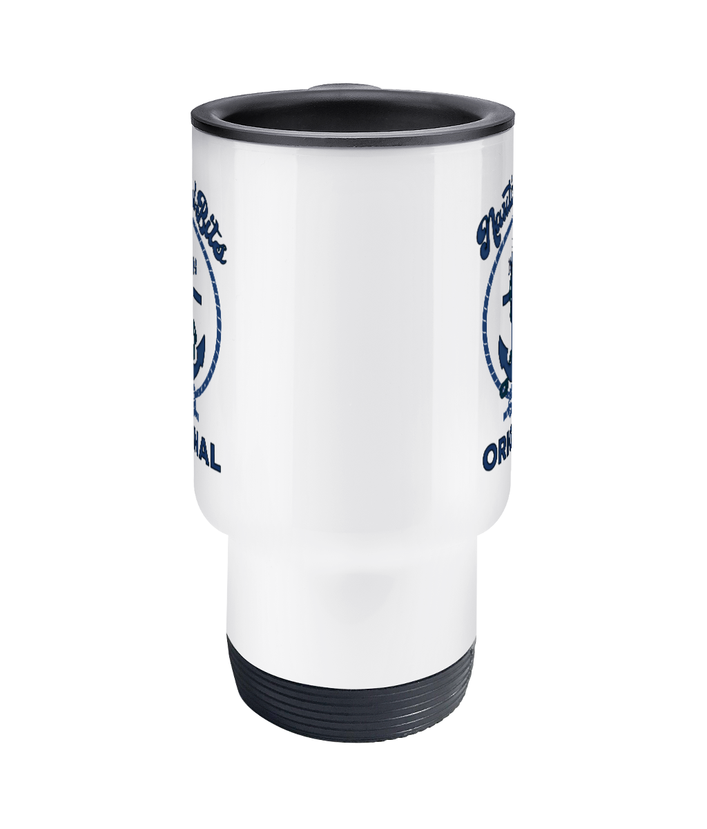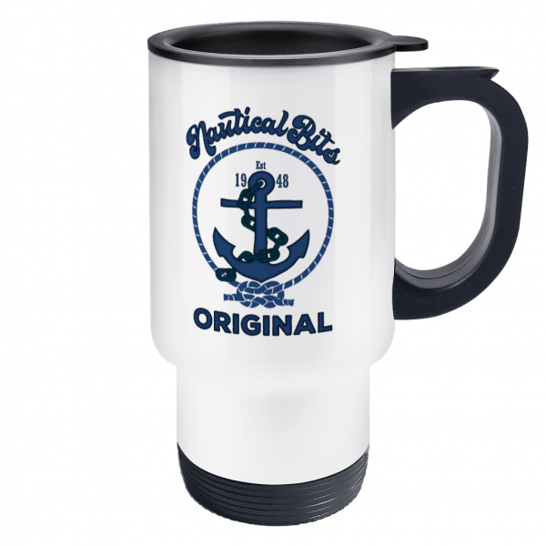 Nautical Bits Original Travel Mug – 14oz stainless steel travel mug with matte white finish. Not suitable for dishwasher or microwave.