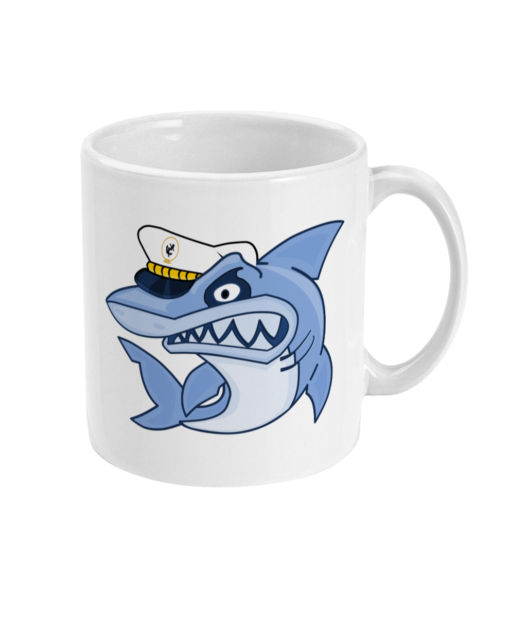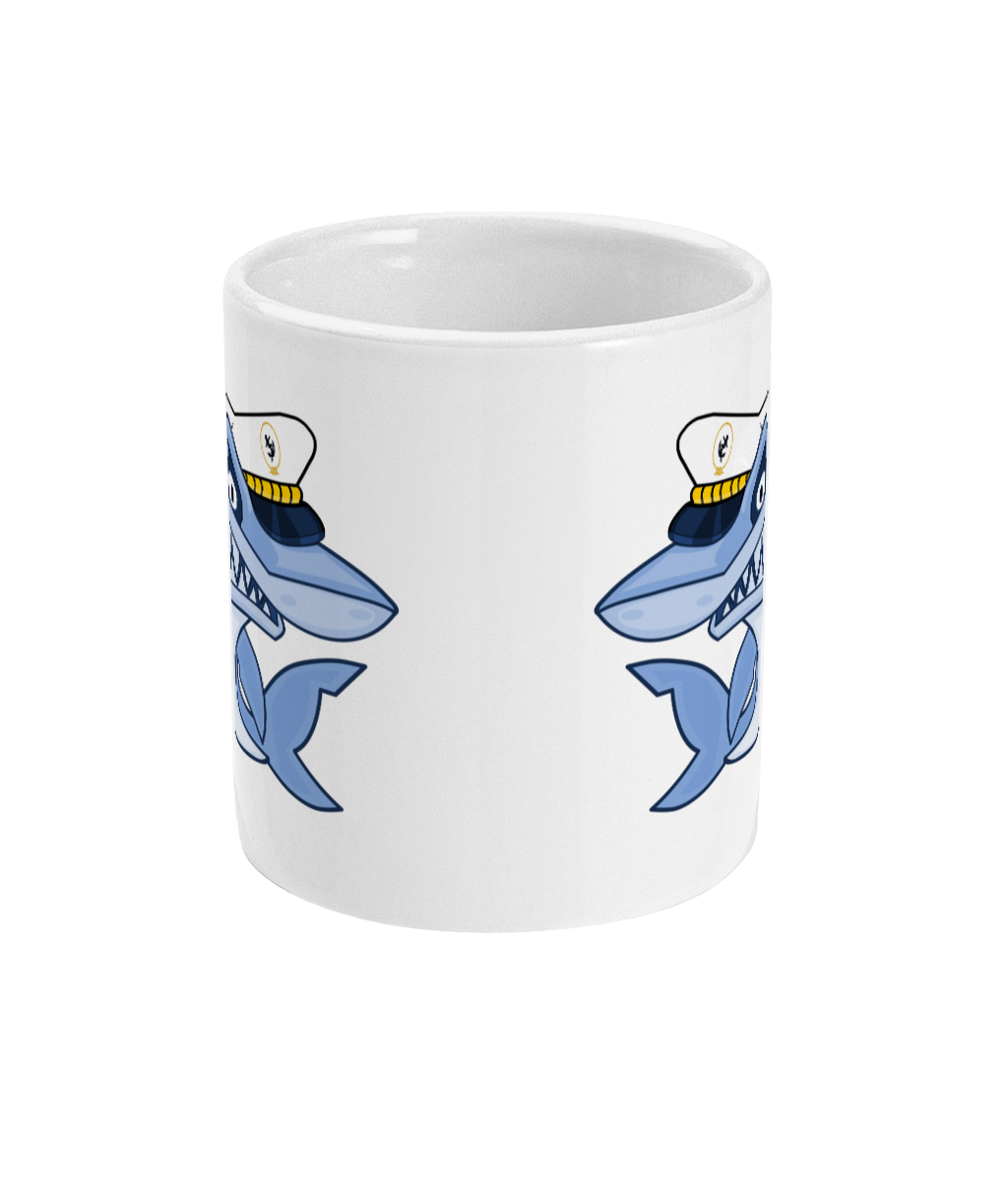 Shark Skipper 11oz glossy white ceramic mug. Dishwasher & Microwave safe.