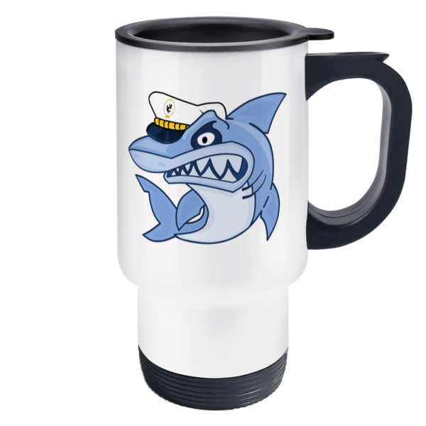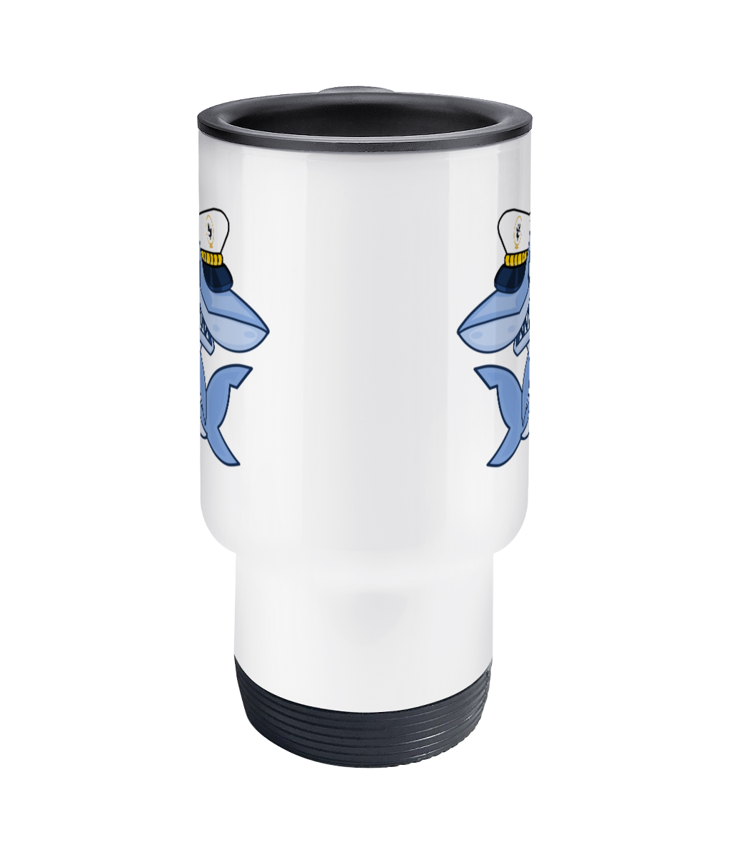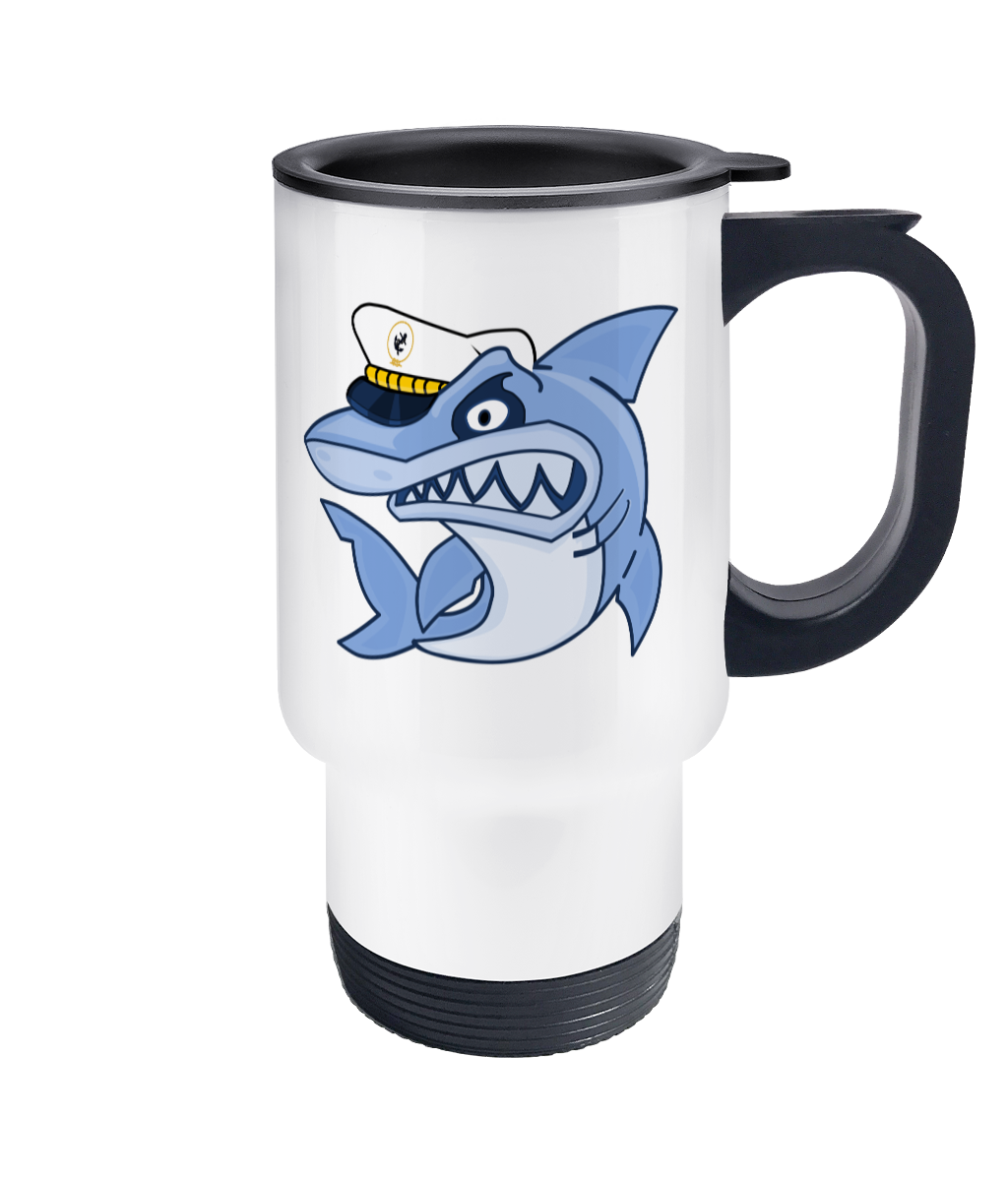 Shark Skipper Travel Mug – 14oz stainless steel travel mug with matte white finish. Not suitable for dishwasher or microwave.