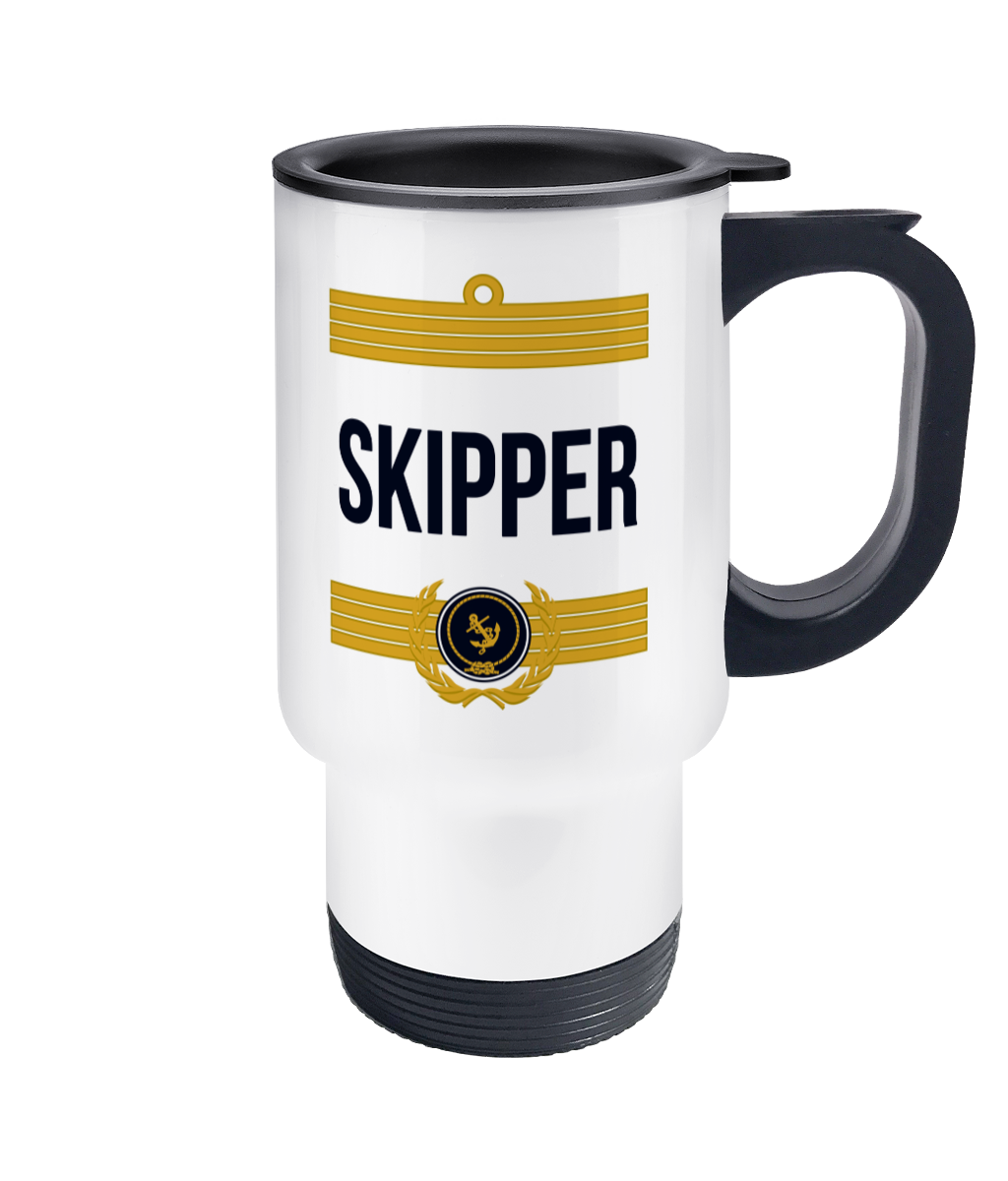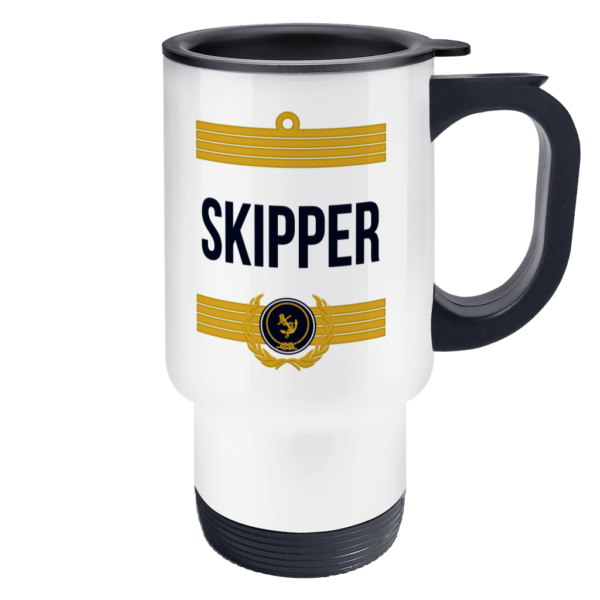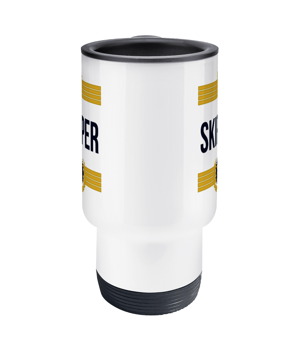 Skipper Stripes Travel Mug – 14oz stainless steel travel mug with matte white finish. Not suitable for dishwasher or microwave.